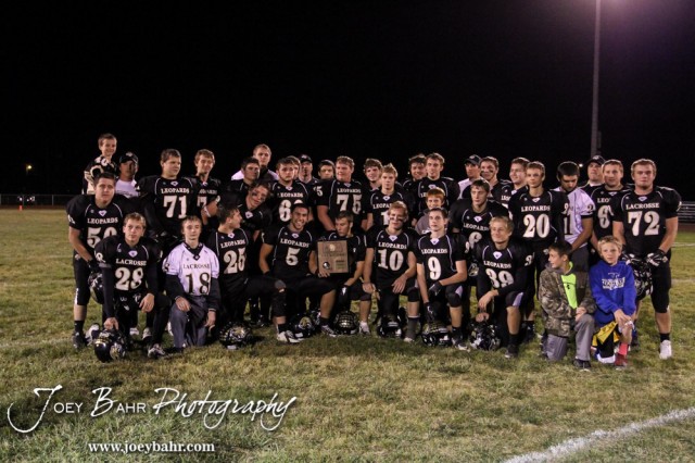 The LaCrosse Leopards pose with the Regional Champoinship Trophy after the KSHSAA Class 2-1A Regional Football game with Meade at LaCrosse with LaCrosse winning 34 to 0 at Bill Schoendaller Athletic Field in LaCrosse, Kansas on November 7, 2014. (Photo: Joey Bahr, www.joeybahr.com)