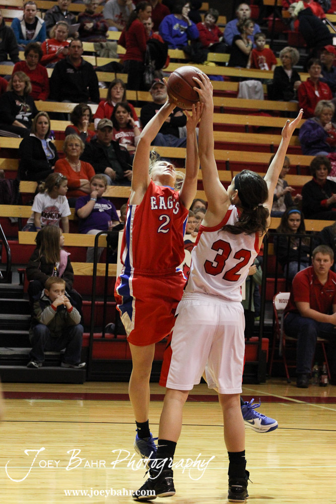 Ellinwood Lady Eagle Sophie Hayes (#2) tries to shoot over Hoisington Lady Cardinal Mallory Flagor (#32) at the 2012 Hoisington Winter Jam Basketball Tournament.