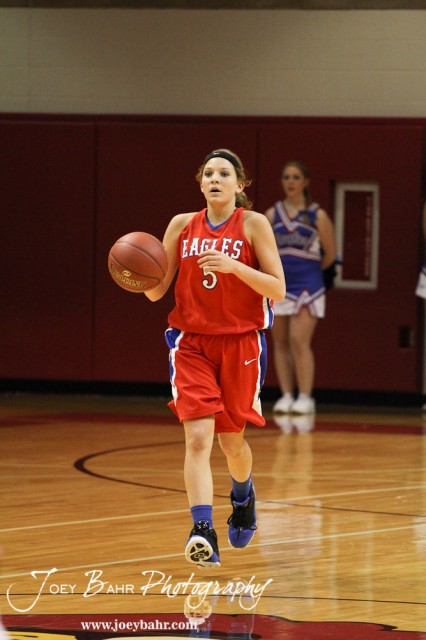 Jenna Snell (#5) of the Ellinwood Lady Eagles takes the ball down the court against the Hoisington Lady Cardinal at the 2012 Hoisington Winter Jam Basketball Tournament.