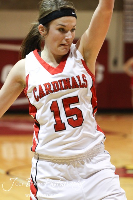 Savannah Rose (#15) of the Hoisington Lady Cardinals defends an inbound pass against the Ellinwood Lady Eagles at the 2012 Hoisington Winter Jam Basketball Tournament.
