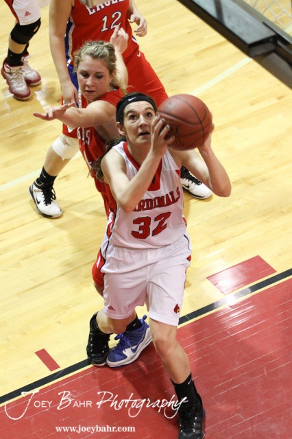 Mallory Flagor (#32) of the Hoisington Lady Cardinals goes up for a shot against the Ellinwood Lady Eagles at the 2012 Hoisington Winter Jam Basketball Tournament.