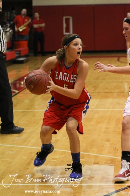 Ellinwood Lady Eagle Jenna Snell (#5) looks for a teammate to pass to against the Hoisington Lady Cardinals at the 2012 Hoisington Winter Jam Basketball Tournament.