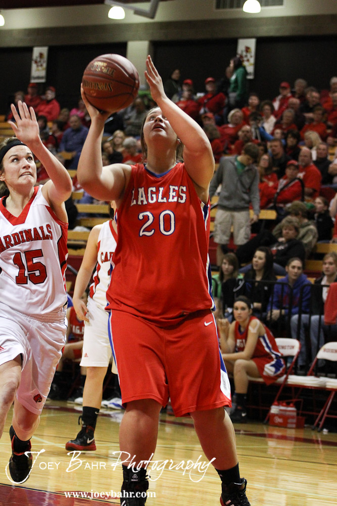 Kelsea Ward (#20) of the Ellinwood Lady Eagles takes a shot down low against the Hoisington Lady Cardinals at the 2012 Hoisington Winter Jam Basketball Tournament.