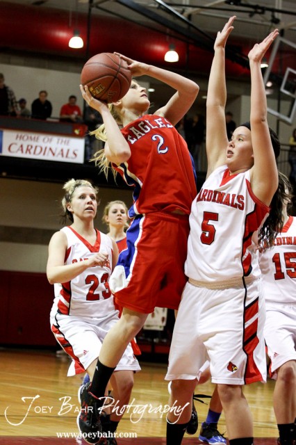 Sophie Hayes (#2) of the Ellinwood Lady Eagles takes a shot against the defense of BreAnna Burns (#5) of the Hoisington Lady Cardinals at the 2012 Hoisington Winter Jam Basketball Tournament.