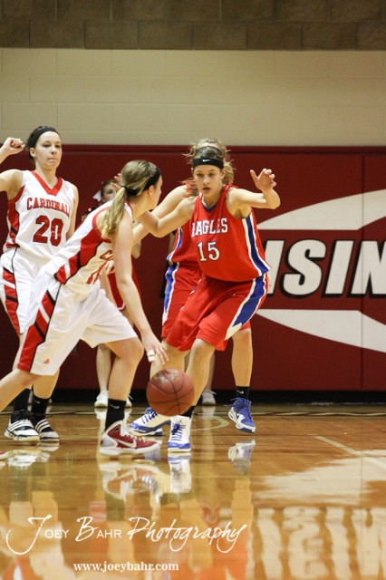 Rachel Doll (#15) of the Ellinwood Lady Eagles defends against the Hoisington Lady Cardinals at the 2012 Hoisington Winter Jam Basketball Tournament.