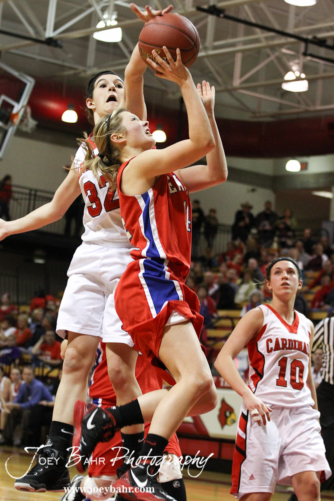 Hoisington Lady Cardinal Mallory Flagor (#32) blocks a shot by Ellinwood Lady Eagle Brooke Panning (#14) at the 2012 Hoisington Winter Jam Basketball Tournament.