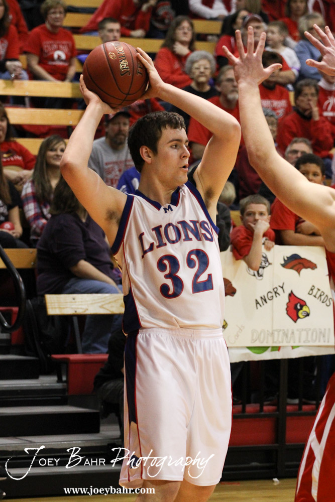 Minneapolis Lion Zach Allison (#32) looks for a teammate to pass the basketball to against the Hoisington Cardinals at the 2012 Hoisington Winter Jam Basketball Tournament.