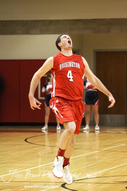 Hoisington Cardinal Cody Stetler (#4) celebrates after dunking the ball on the Minneapolis Lions at the 2012 Hoisington Winter Jam Basketball Tournament.