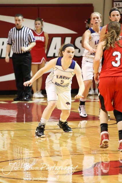 Russell Lady Bronco Alex Ptacek (#5) lines up to defend Mykela Riedl (#3) of the Hoisington Lady Cardinals at the 2012 Hoisington Winter Jam Basketball Tournament.