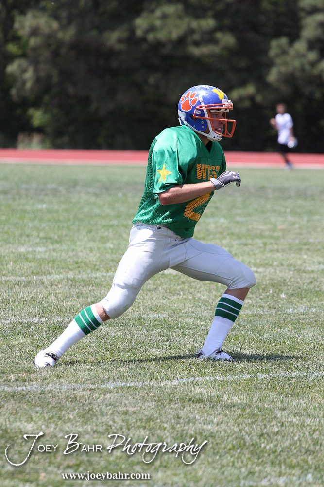 West All-Star Matt Crotinger of Otis-Bison High School (#28) runs towards the ball during the Kansas Eight Man Football Association Division II All-Star Game at Trojan Field in Beloit, Kansas on June 9, 2012. (Photo: Joey Bahr, www.joeybahr.com)