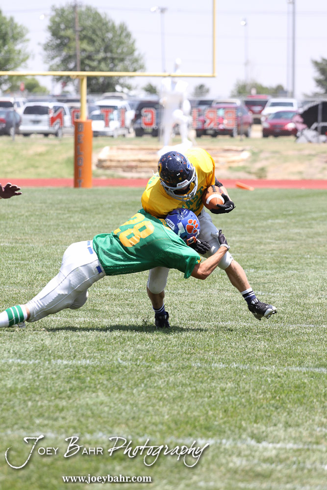 West All-Star Matt Crotinger of Otis-Bison High School (#28) tackles East All-Star Mitch Engelken of Baileyville B&B High School (#40) during the Kansas Eight Man Football Association Division II All-Star Game at Trojan Field in Beloit, Kansas on June 9, 2012. (Photo: Joey Bahr, www.joeybahr.com)