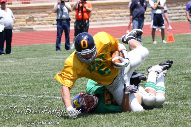 East All-Star Cody Heiman of Baileyville B&B High School (#5) scores while West All-Star Matt Crotinger of Otis-Bison High School (#28) tackles him during the Kansas Eight Man Football Association Division II All-Star Game at Trojan Field in Beloit, Kansas on June 9, 2012. (Photo: Joey Bahr, www.joeybahr.com)