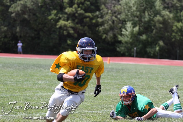 East All-Star Mitch Engelken of Baileyville B&B High School (#40) while West All-Star Matt Crotinger of Otis-Bison High School (#28) reacts to missing the tackle during the Kansas Eight Man Football Association Division II All-Star Game at Trojan Field in Beloit, Kansas on June 9, 2012. (Photo: Joey Bahr, www.joeybahr.com)