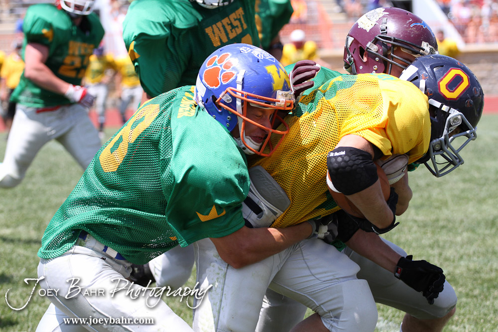 West All-Stars Matt Crotinger of Otis-Bison High School (#28) and Corey Dinkel of Victoria High School (#2) tackle East All-Star Mitch Engelken of Baileyville B&B High School (#40) during the Kansas Eight Man Football Association Division II All-Star Game at Trojan Field in Beloit, Kansas on June 9, 2012. (Photo: Joey Bahr, www.joeybahr.com)