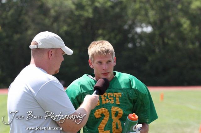 West All-Star Matt Crotinger of Otis-Bison High School (#28) talks to radio reporter Mike McKenna during the Kansas Eight Man Football Association Division II All-Star Game at Trojan Field in Beloit, Kansas on June 9, 2012. (Photo: Joey Bahr, www.joeybahr.com)