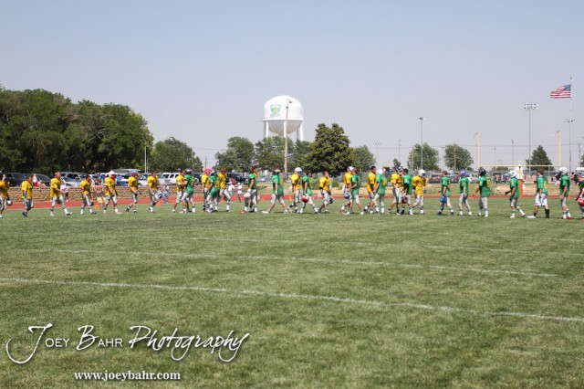 East All-Stars and West All-Stars shake hands after the Kansas Eight Man Football Association Division II All-Star Game at Trojan Field in Beloit, Kansas on June 9, 2012. (Photo: Joey Bahr, www.joeybahr.com)