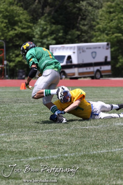 West All-Star Osvaldo Granillo of Moscow High School (#7) breaks the tackle of Brent Bruna of Hanover High School (#7) on a 68 yard kickoff return during the Kansas Eight Man Football Association Division II All-Star Game at Trojan Field in Beloit, Kansas on June 9, 2012. (Photo: Joey Bahr, www.joeybahr.com)