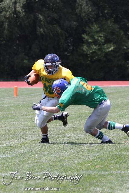 West All-Star Patrick Piper of Otis-Bison High School (#4) tackles East All-Star Mitch Engelken of Baileyville B&B High School (#40) during the Kansas Eight Man Football Association Division II All-Star Game at Trojan Field in Beloit, Kansas on June 9, 2012. (Photo: Joey Bahr, www.joeybahr.com)