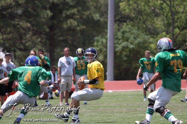 East All-Star Quarterback Eric Huerter of Baileyville B&B High School (#8) looks for a receiver during the Kansas Eight Man Football Association Division II All-Star Game at Trojan Field in Beloit, Kansas on June 9, 2012. (Photo: Joey Bahr, www.joeybahr.com)
