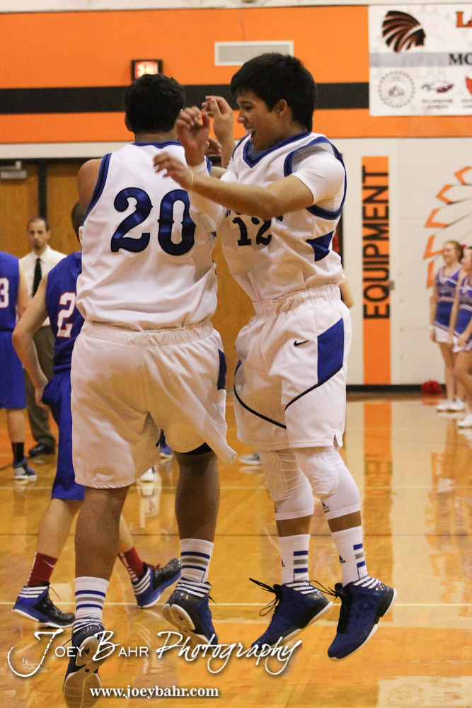 St. John Tigers Spencer Nusser (#20) and Omar Ramirez (#12) greet each other during the Ellinwood Eagles versus St. John Tigers First Round Game with St. John winning 55 to 26 at the 6th Annual Keady Basketball Classic held at Larned Middle School in Larned, Kansas on December 4, 2012. (Photo: Joey Bahr, www.joeybahr.com)