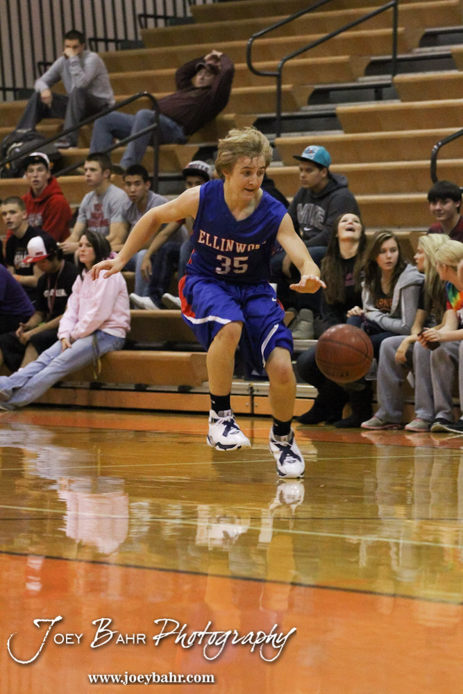 Ellinwood Eagle Gavin Vink (#35) dribbles the ball during the Ellinwood Eagles versus St. John Tigers First Round Game with St. John winning 55 to 26 at the 6th Annual Keady Basketball Classic held at Larned Middle School in Larned, Kansas on December 4, 2012. (Photo: Joey Bahr, www.joeybahr.com)