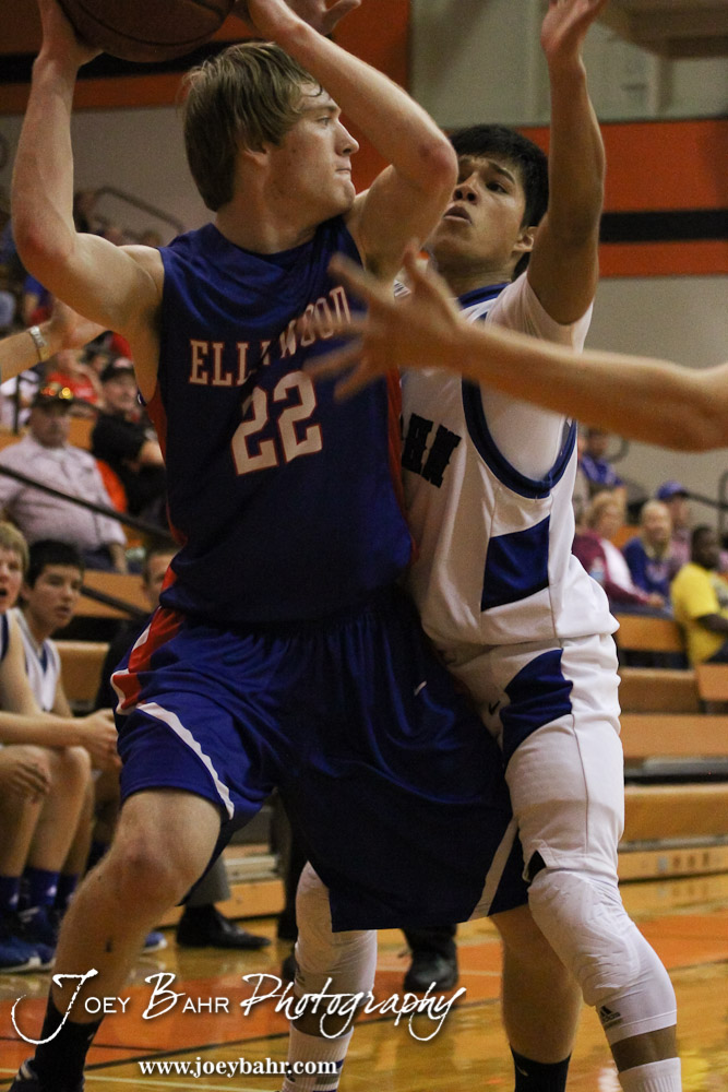 Ellinwood Eagle Tanner Swank (#22) looks to pass while being defend by St. John Tiger Omar Ramirez (#12) during the Ellinwood Eagles versus St. John Tigers First Round Game with St. John winning 55 to 26 at the 6th Annual Keady Basketball Classic held at Larned Middle School in Larned, Kansas on December 4, 2012. (Photo: Joey Bahr, www.joeybahr.com)