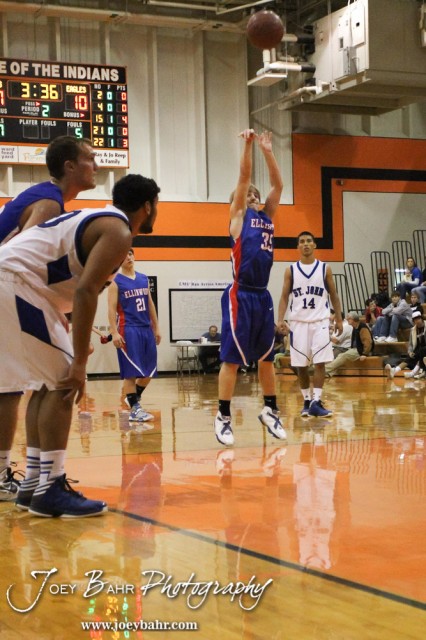 Ellinwood Eagle Gavin Vink (#35) shoots a free throw attempt during the Ellinwood Eagles versus St. John Tigers First Round Game with St. John winning 55 to 26 at the 6th Annual Keady Basketball Classic held at Larned Middle School in Larned, Kansas on December 4, 2012. (Photo: Joey Bahr, www.joeybahr.com)