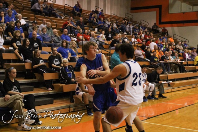 Ellinwood Eagle Tanner Swank (#22) throws a bounce pass by St. John Tiger Ethan Long (#23) during the Ellinwood Eagles versus St. John Tigers First Round Game with St. John winning 55 to 26 at the 6th Annual Keady Basketball Classic held at Larned Middle School in Larned, Kansas on December 4, 2012. (Photo: Joey Bahr, www.joeybahr.com)