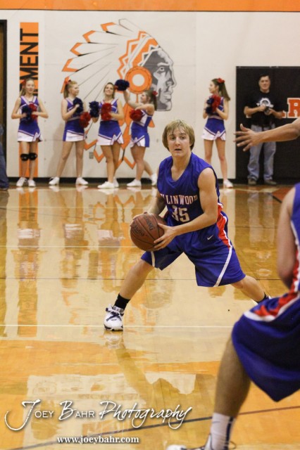 Ellinwood Eagle Gavin Vink (#35) looks to pass the ball during the Ellinwood Eagles versus St. John Tigers First Round Game with St. John winning 55 to 26 at the 6th Annual Keady Basketball Classic held at Larned Middle School in Larned, Kansas on December 4, 2012. (Photo: Joey Bahr, www.joeybahr.com)