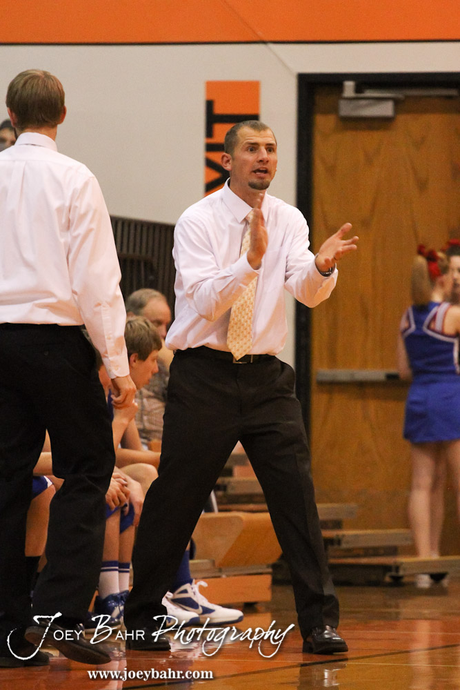 Ellinwood Eagle Head Coach Dustin Klassen talks to his players during the Ellinwood Eagles versus St. John Tigers First Round Game with St. John winning 55 to 26 at the 6th Annual Keady Basketball Classic held at Larned Middle School in Larned, Kansas on December 4, 2012. (Photo: Joey Bahr, www.joeybahr.com)