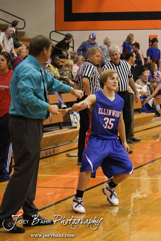 Ellinwood Eagle Gavin Vink (#35) bumps fists with St. John Tiger Head Coach Clint Kinnamon during the Ellinwood Eagles versus St. John Tigers First Round Game with St. John winning 55 to 26 at the 6th Annual Keady Basketball Classic held at Larned Middle School in Larned, Kansas on December 4, 2012. (Photo: Joey Bahr, www.joeybahr.com)