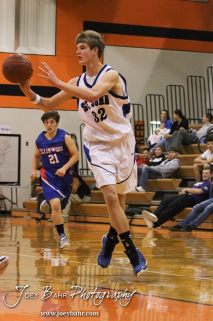 St. John Tiger Dean Wade (#32) passes the ball to a teammate during the Ellinwood Eagles versus St. John Tigers First Round Game with St. John winning 55 to 26 at the 6th Annual Keady Basketball Classic held at Larned Middle School in Larned, Kansas on December 4, 2012. (Photo: Joey Bahr, www.joeybahr.com)