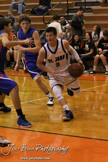 St. John Tiger Kade Kinnamon (#3) drives towards the baseline during the Ellinwood Eagles versus St. John Tigers First Round Game with St. John winning 55 to 26 at the 6th Annual Keady Basketball Classic held at Larned Middle School in Larned, Kansas on December 4, 2012. (Photo: Joey Bahr, www.joeybahr.com)