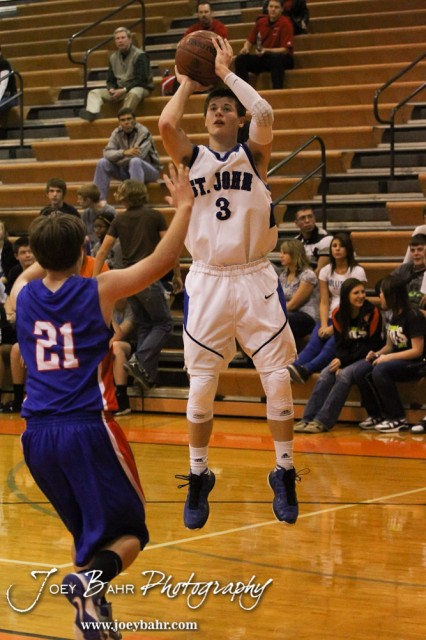 St. John Tiger Kade Kinnamon (#3) shoots a jump shot during the Ellinwood Eagles versus St. John Tigers First Round Game with St. John winning 55 to 26 at the 6th Annual Keady Basketball Classic held at Larned Middle School in Larned, Kansas on December 4, 2012. (Photo: Joey Bahr, www.joeybahr.com)