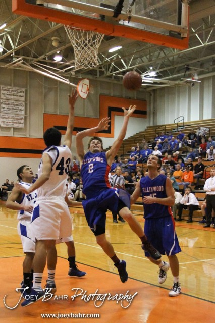 Ellinwood Eagle Patrick Ringering (#2) goes up for a layup while St. John Tiger Jesus Alvarez (#43) tries to block his shot during the Ellinwood Eagles versus St. John Tigers First Round Game with St. John winning 55 to 26 at the 6th Annual Keady Basketball Classic held at Larned Middle School in Larned, Kansas on December 4, 2012. (Photo: Joey Bahr, www.joeybahr.com)