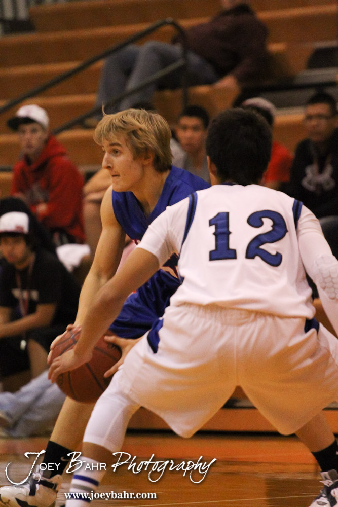Ellinwood Eagle Gavin Vink (#35) looks for a teammate to pass to while St. John Tiger Omar Ramirez (#12) defends during the Ellinwood Eagles versus St. John Tigers First Round Game with St. John winning 55 to 26 at the 6th Annual Keady Basketball Classic held at Larned Middle School in Larned, Kansas on December 4, 2012. (Photo: Joey Bahr, www.joeybahr.com)