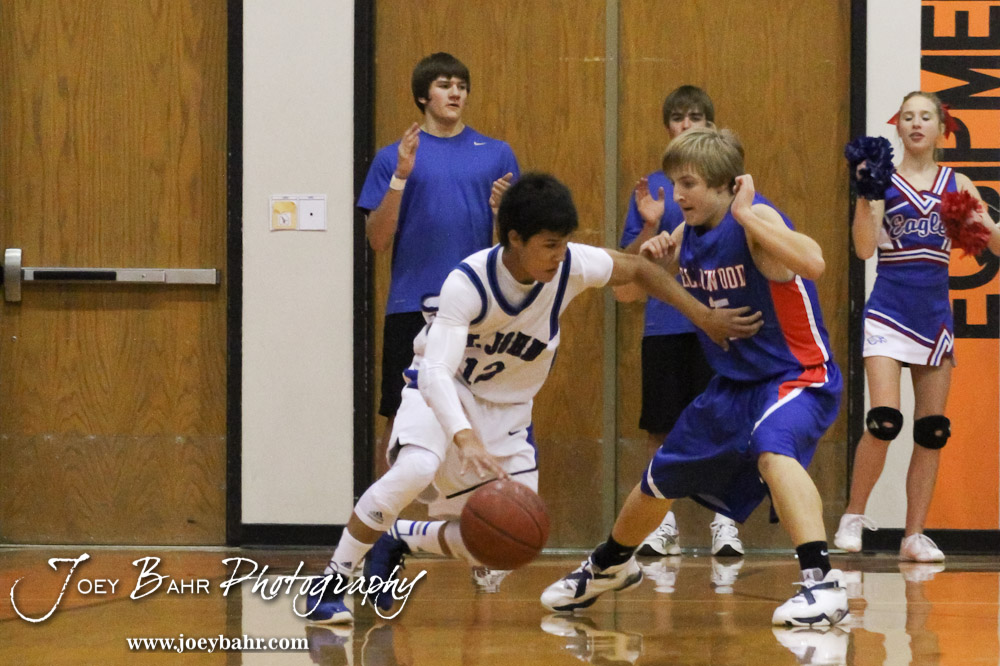 St. John Tiger Omar Ramirez (#12) drives past Ellinwood Eagle Gavin Vink (#35) during the Ellinwood Eagles versus St. John Tigers First Round Game with St. John winning 55 to 26 at the 6th Annual Keady Basketball Classic held at Larned Middle School in Larned, Kansas on December 4, 2012. (Photo: Joey Bahr, www.joeybahr.com)