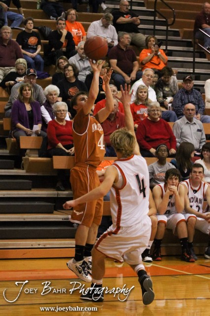 Kiowa County Maverick Caleb Davis (#4) shoots a three point shot while Larned Indian Grant Unruh (#4) defends during the Larned Indians versus Kiowa County Mavericks First Round Game with Kiowa County winning 63 to 45 at the 6th Annual Keady Basketball Classic held at Larned Middle School in Larned, Kansas on December 3, 2012. (Photo: Joey Bahr, www.joeybahr.com)