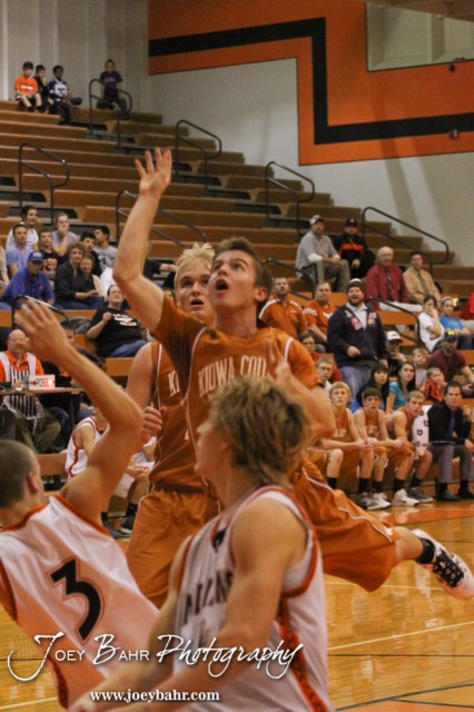 Kiowa County Maverick Caleb Davis (#4) watches a shot go towards the basket during the Larned Indians versus Kiowa County Mavericks First Round Game with Kiowa County winning 63 to 45 at the 6th Annual Keady Basketball Classic held at Larned Middle School in Larned, Kansas on December 3, 2012. (Photo: Joey Bahr, www.joeybahr.com)