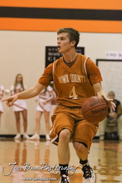 Kiowa County Maverick Caleb Davis (#4) dribbles down the court during the Larned Indians versus Kiowa County Mavericks First Round Game with Kiowa County winning 63 to 45 at the 6th Annual Keady Basketball Classic held at Larned Middle School in Larned, Kansas on December 3, 2012. (Photo: Joey Bahr, www.joeybahr.com)