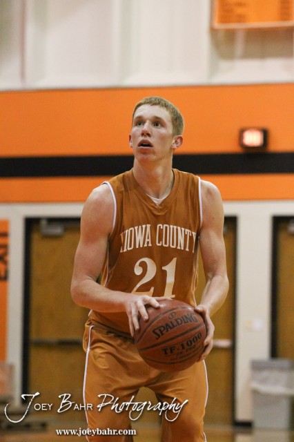 Kiowa County Maverick Rustin Ardery (#21) shoots a free throw attempt during the Larned Indians versus Kiowa County Mavericks First Round Game with Kiowa County winning 63 to 45 at the 6th Annual Keady Basketball Classic held at Larned Middle School in Larned, Kansas on December 3, 2012. (Photo: Joey Bahr, www.joeybahr.com)