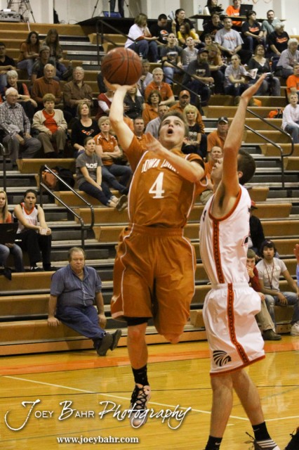 Kiowa County Maverick Caleb Davis (#4) goes up for a layup during the Larned Indians versus Kiowa County Mavericks First Round Game with Kiowa County winning 63 to 45 at the 6th Annual Keady Basketball Classic held at Larned Middle School in Larned, Kansas on December 3, 2012. (Photo: Joey Bahr, www.joeybahr.com)