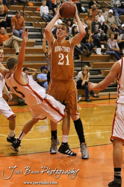 Larned Indian Michael Reece (#25) tries to block Kiowa County Maverick Rustin Ardery (#21) from taking a shot during the Larned Indians versus Kiowa County Mavericks First Round Game with Kiowa County winning 63 to 45 at the 6th Annual Keady Basketball Classic held at Larned Middle School in Larned, Kansas on December 3, 2012. (Photo: Joey Bahr, www.joeybahr.com)