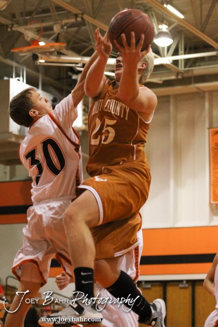 Larned Indian Zach Wilson (#30) defends against Kiowa County Maverick Damien Odle’s (#25) layup attempt during the Larned Indians versus Kiowa County Mavericks First Round Game with Kiowa County winning 63 to 45 at the 6th Annual Keady Basketball Classic held at Larned Middle School in Larned, Kansas on December 3, 2012. (Photo: Joey Bahr, www.joeybahr.com)