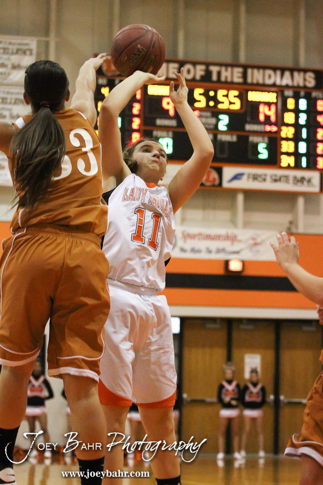 Kiowa County Lady Maverick Angela Liggett (#33) blocks the shot of Larned Lady Indian Reagan Quick (#11) during the Larned Lady Indians versus Kiowa County Lady Mavericks First Round Game with Larned winning 50 to 39 at the 6th Annual Keady Basketball Classic held at Larned Middle School in Larned, Kansas on December 3, 2012. (Photo: Joey Bahr, www.joeybahr.com)