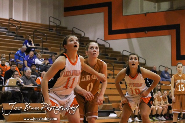 Larned Lady Indian Reagan Quick (#11), Kiowa County Lady Maverick Katelynn Gamble (#0), and Larned Lady Indian Bailey Schartz (#10) watch the ball during a free throw attempt during the Larned Lady Indians versus Kiowa County Lady Mavericks First Round Game with Larned winning 50 to 39 at the 6th Annual Keady Basketball Classic held at Larned Middle School in Larned, Kansas on December 3, 2012. (Photo: Joey Bahr, www.joeybahr.com)
