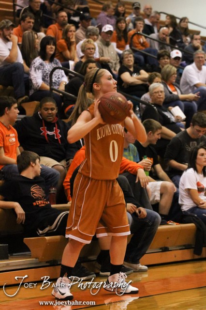 Kiowa County Lady Maverick Katelynn Gamble (#0) throws the ball into play during the Larned Lady Indians versus Kiowa County Lady Mavericks First Round Game with Larned winning 50 to 39 at the 6th Annual Keady Basketball Classic held at Larned Middle School in Larned, Kansas on December 3, 2012. (Photo: Joey Bahr, www.joeybahr.com)