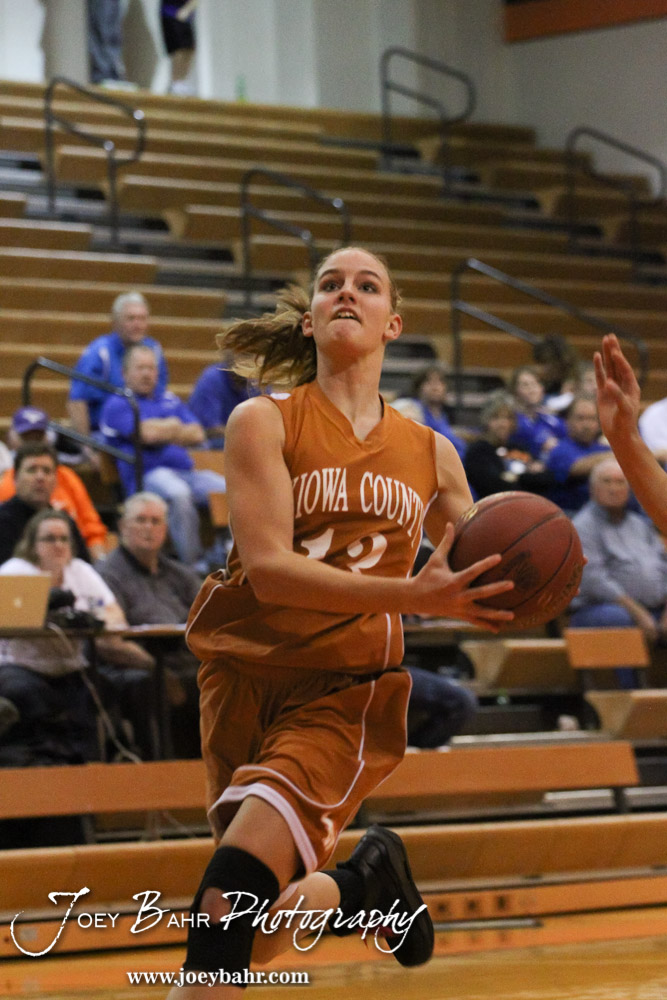 Kiowa County Lady Maverick Heather Melton (#13) goes up for a layup during the Larned Lady Indians versus Kiowa County Lady Mavericks First Round Game with Larned winning 50 to 39 at the 6th Annual Keady Basketball Classic held at Larned Middle School in Larned, Kansas on December 3, 2012. (Photo: Joey Bahr, www.joeybahr.com)