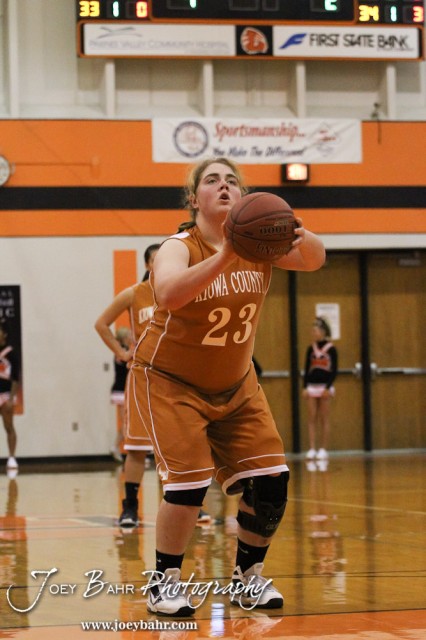 Kiowa County Lady Maverick Halie Headrick (#23) shoots a free throw attempt during the Larned Lady Indians versus Kiowa County Lady Mavericks First Round Game with Larned winning 50 to 39 at the 6th Annual Keady Basketball Classic held at Larned Middle School in Larned, Kansas on December 3, 2012. (Photo: Joey Bahr, www.joeybahr.com)