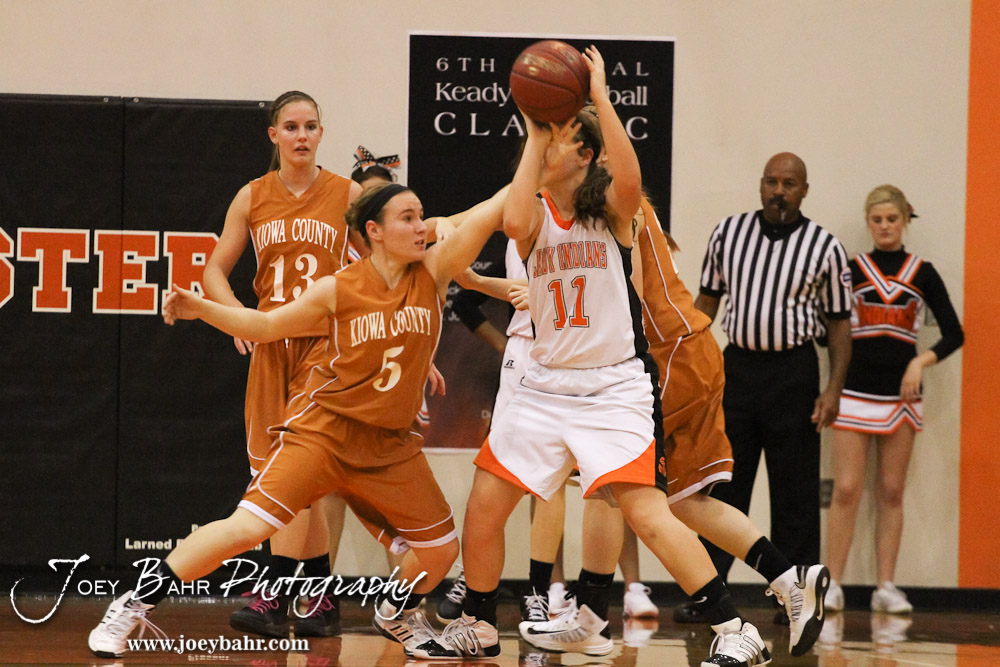 Kiowa County Lady Maverick Chelsea Oberle (#5) reaches in while Larned Lady Indian Reagan Quick (#11) looks to make a pass during the Larned Lady Indians versus Kiowa County Lady Mavericks First Round Game with Larned winning 50 to 39 at the 6th Annual Keady Basketball Classic held at Larned Middle School in Larned, Kansas on December 3, 2012. (Photo: Joey Bahr, www.joeybahr.com)